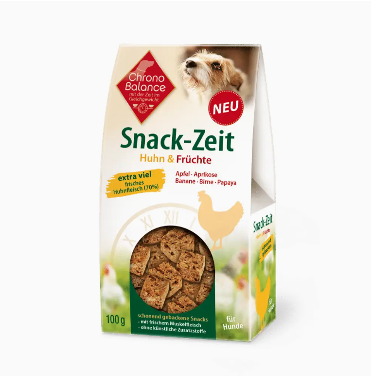The fresh chicken provides high-quality proteins and the fruit provides an extra boost of freshness. Apples and apricots contain valuable vitamins and bananas provide valuable minerals. Pamper your dog with this first-class recipe and high-quality ingredients. At the same time, you support his well-being because ChronoBalance snacks are free from grains, gluten, artificial ingredients and no added sugar.